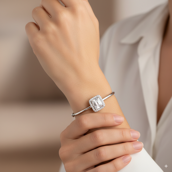 Sleek, sophisticated, and endlessly versatile — the Classic Silver Adjustable Square Shape Stone Bangle by Meama Jewels is the definition of modern elegance.